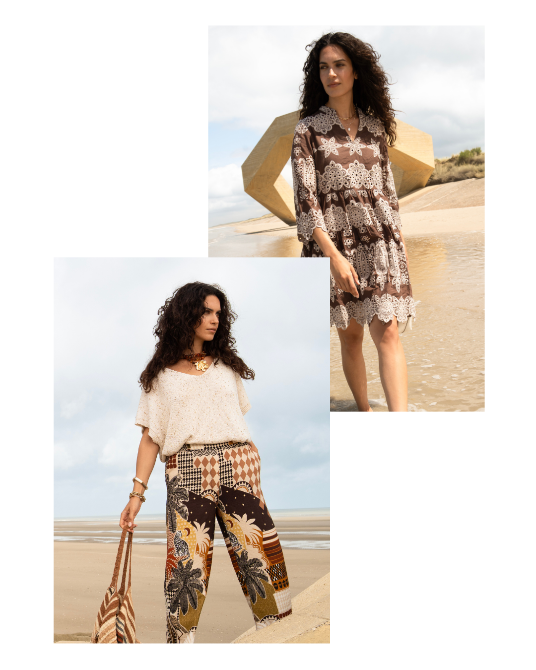 Les imprimés rappellent les traces laissées par le vent sur la roche ou le sable, dans une interprétation chic et maîtrisée du vestiaire d'été.