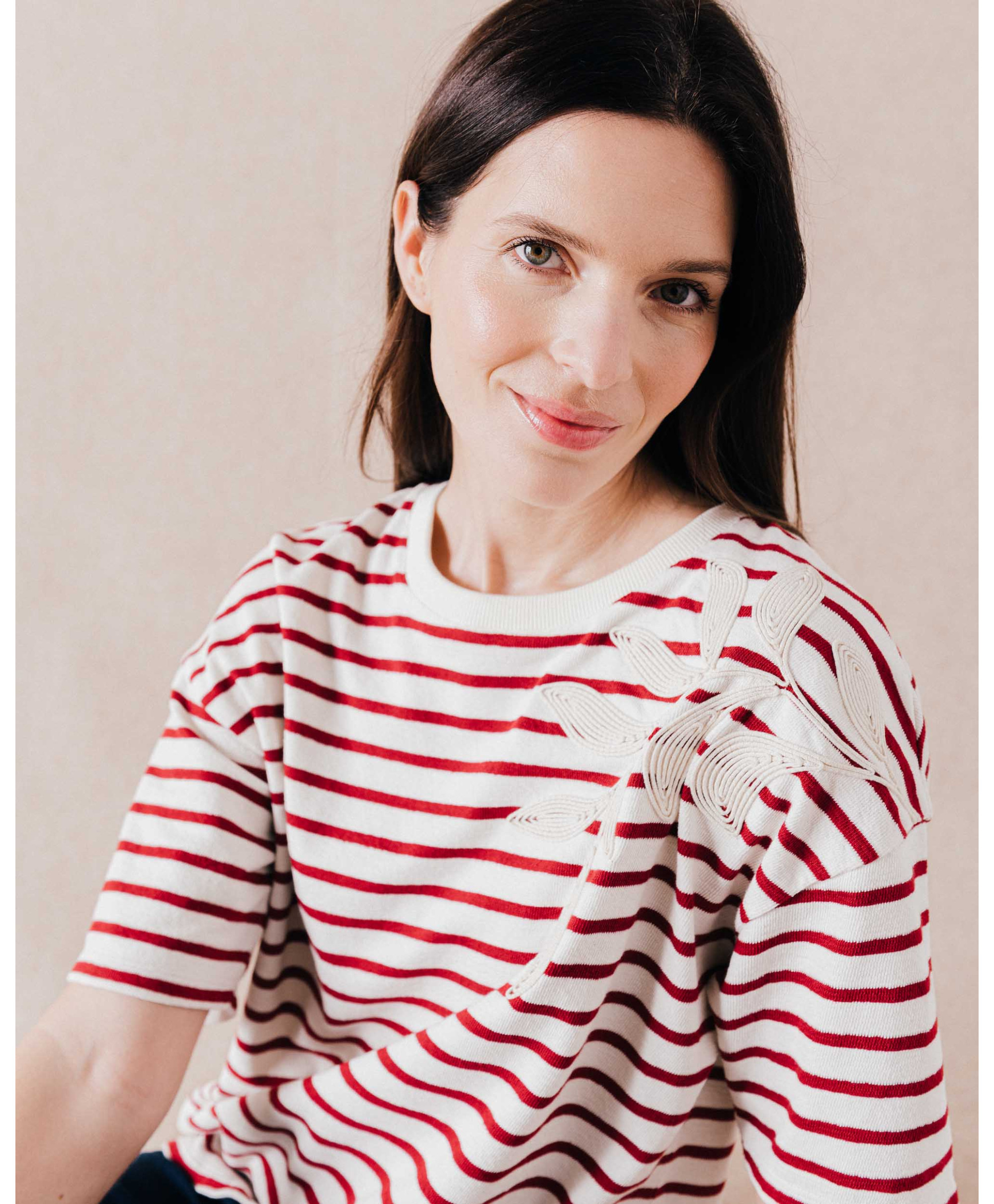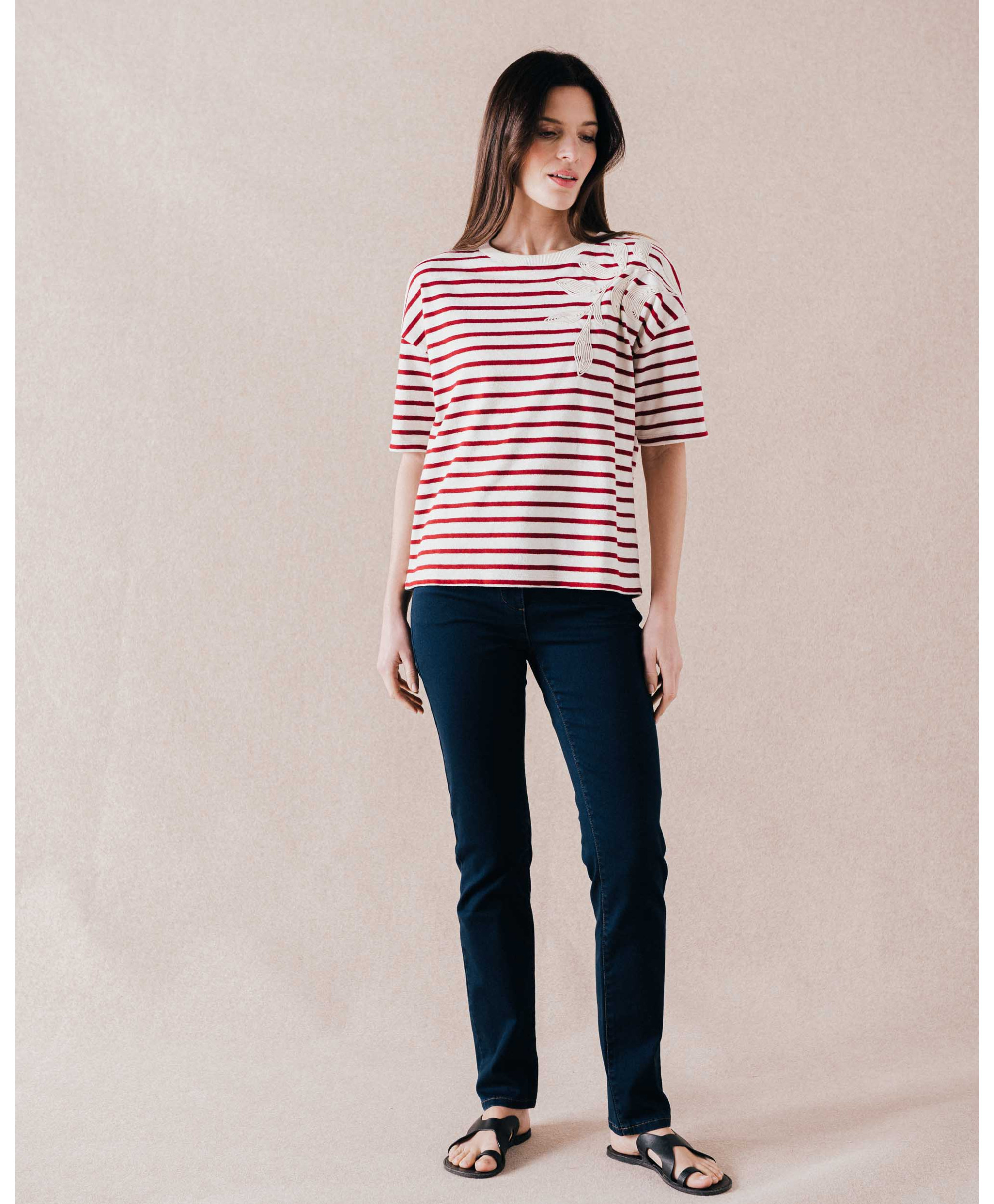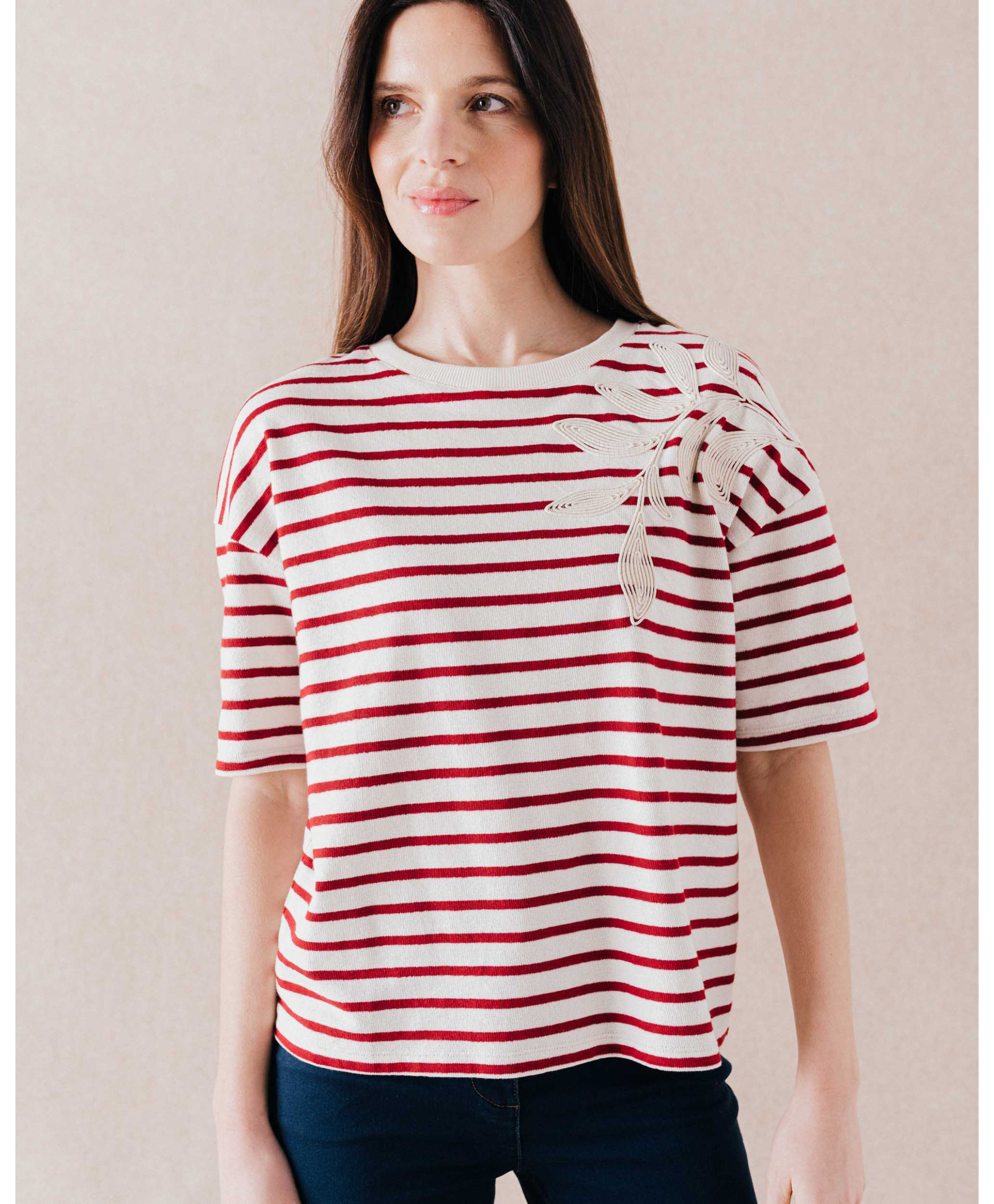 • Imprimé rayé et broderie sur l'épaule
