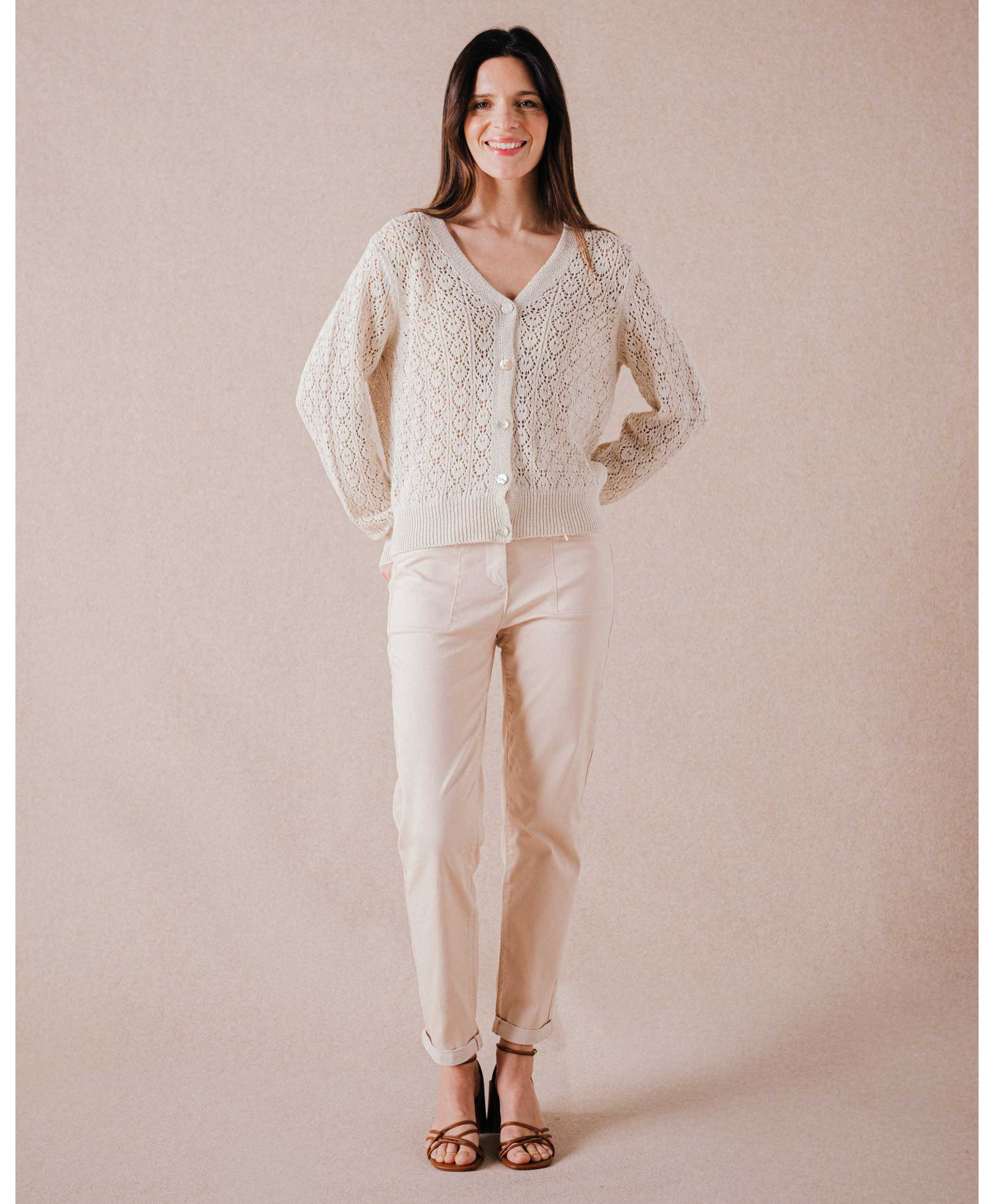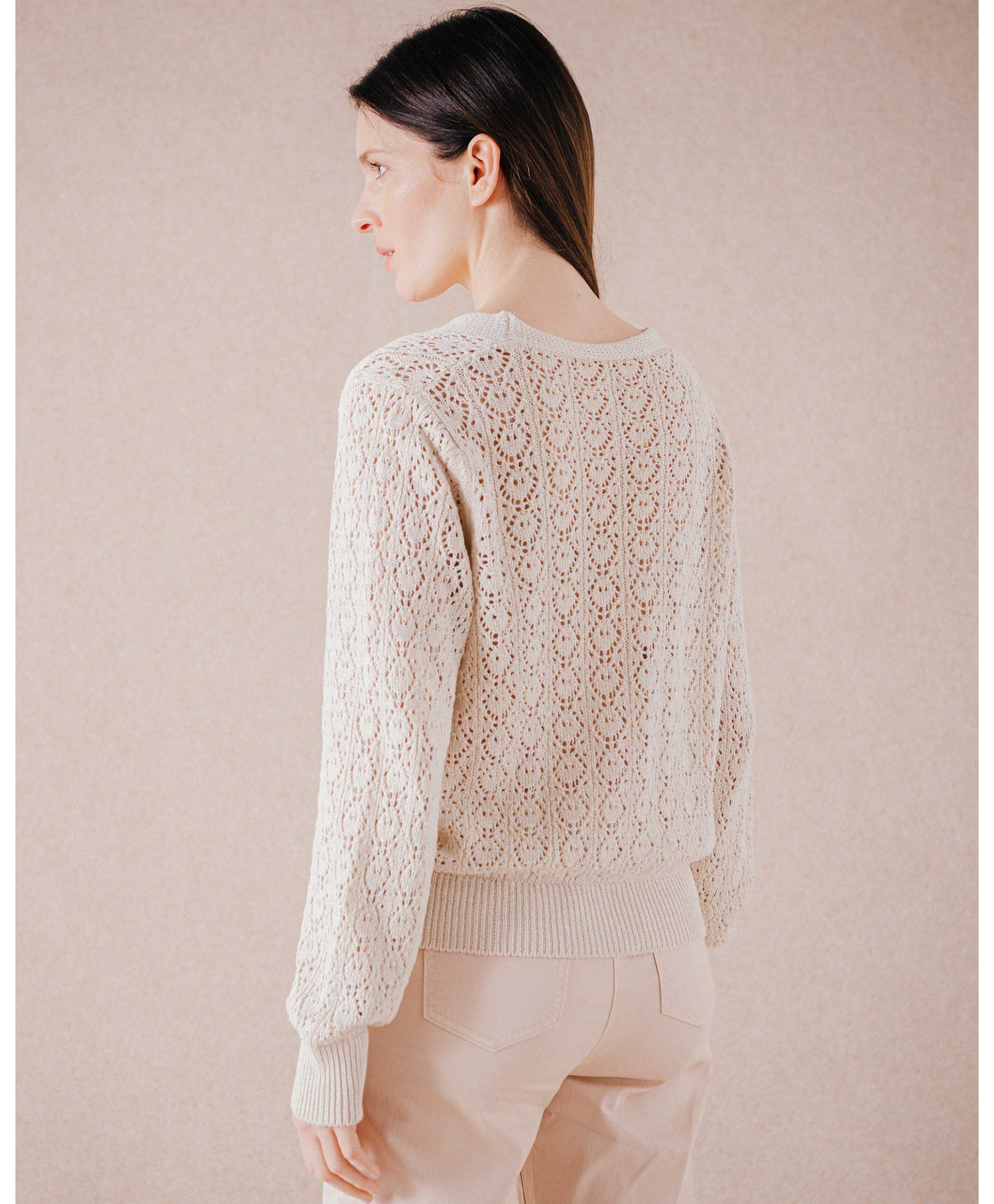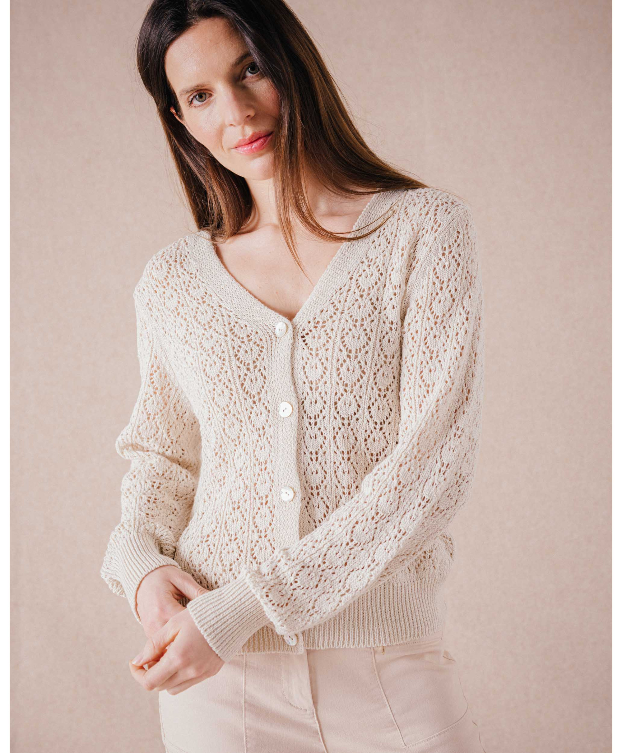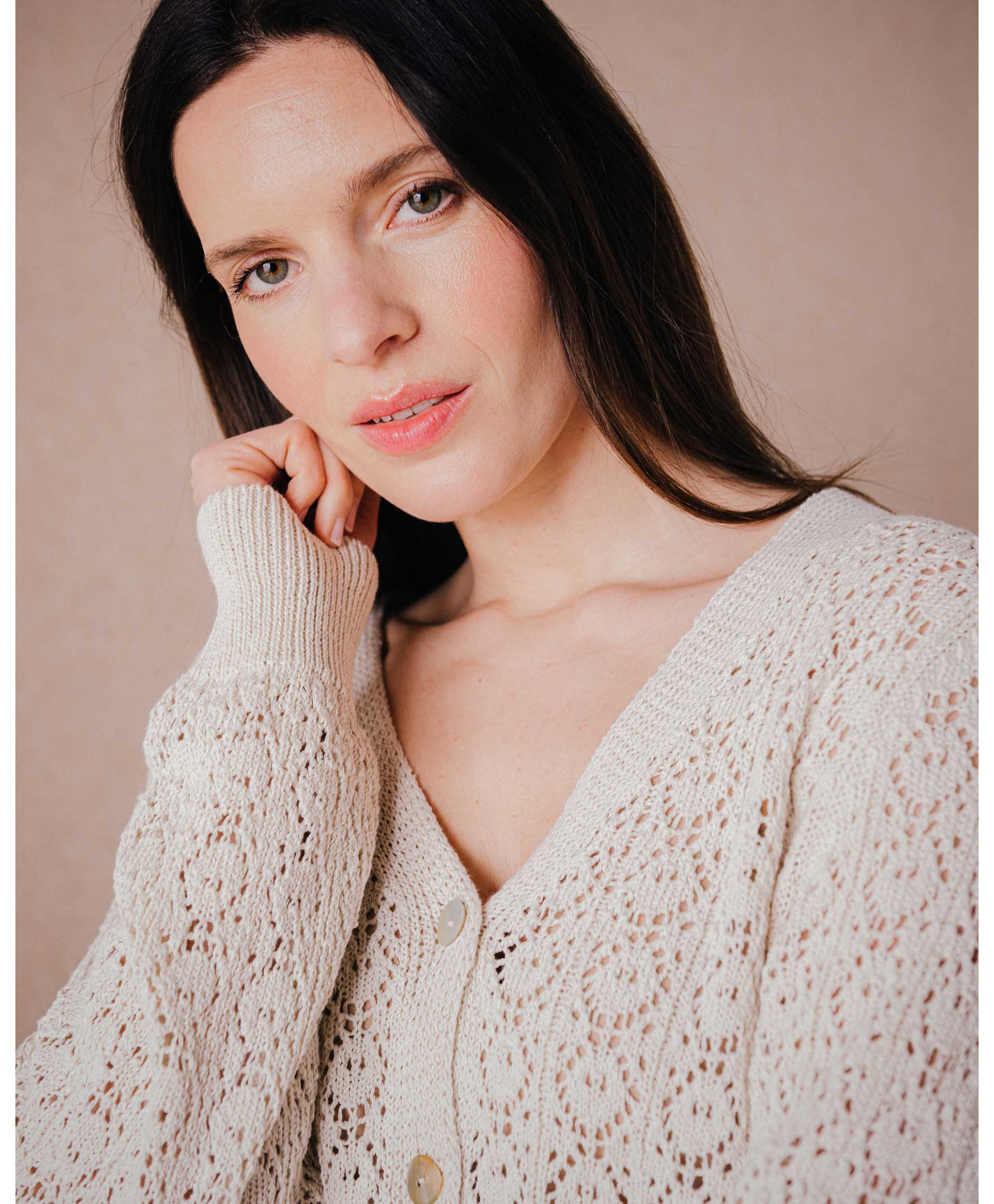 On aime ce gilet confectionné dans une maille ajourée délicate. Parfait sur une jupe. Une pièce essentielle du dressing.