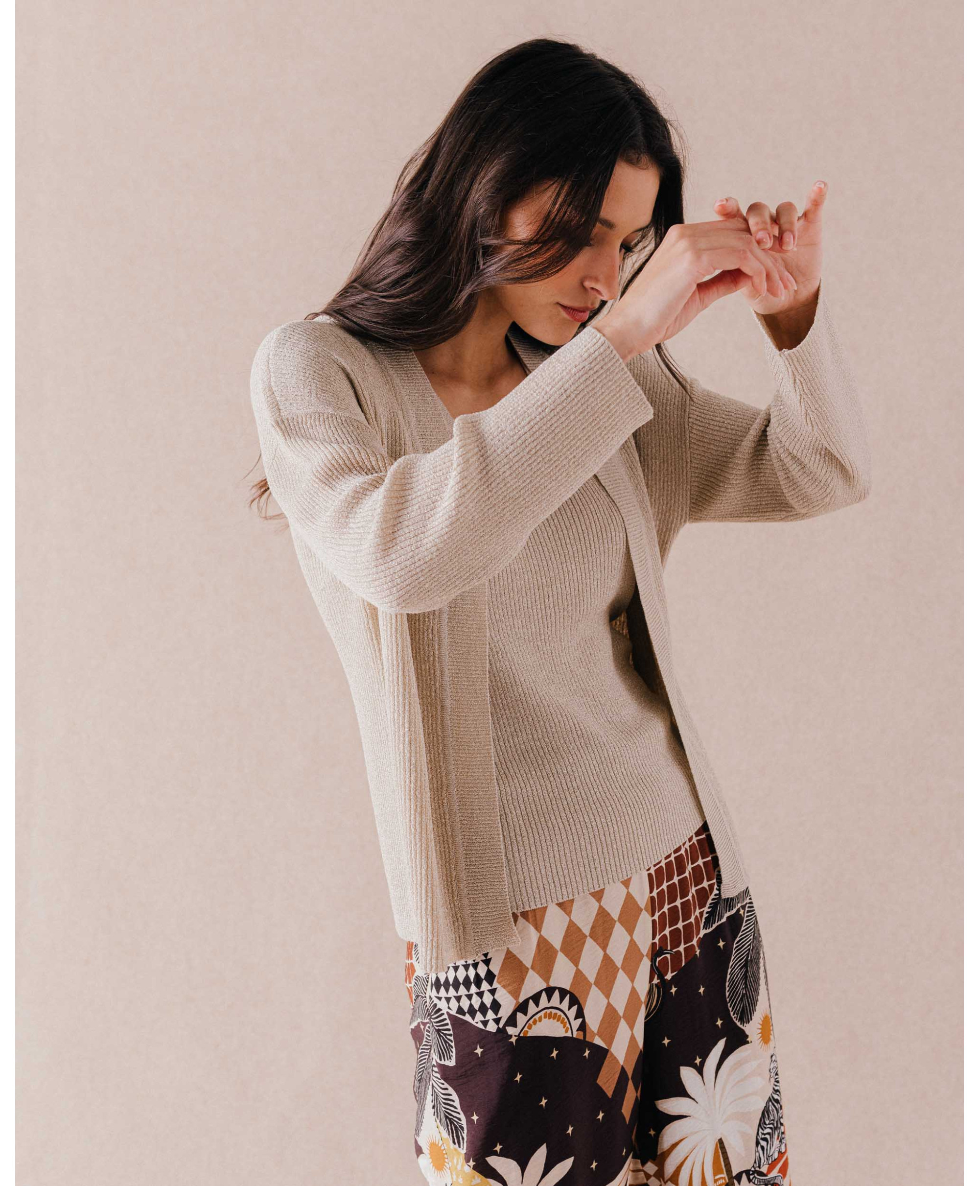 On aime ce gilet ouvert dans une maille lurex. Parfait pour le printemps.